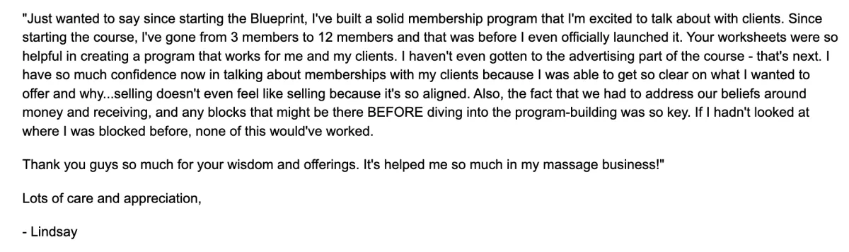 This program helped me find my niche as a LMT and my ad is bringing me my ideal clients so l am very grateful. I recommend the Bodywork Blueprint to anyone I can. Thank you!"